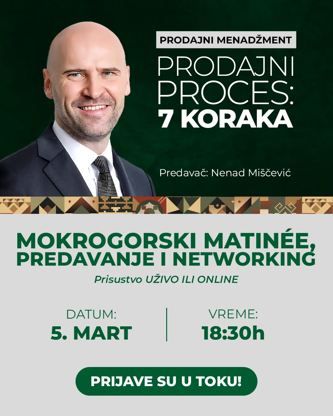 Zato i ove godine nastavljamo sa BESPLATNIM MOKROGORSKIM MATINÉE-OM, ovoga puta na temu „Prodajni proces: 7 koraka“, namenjenom menadžerima, preduzetnicima i svima koji žele da razumeju kako se prodajni sistem gradi, vodi i unapređuje tako da direktno utiče na rast, stabilnost i razvoj kompanije.